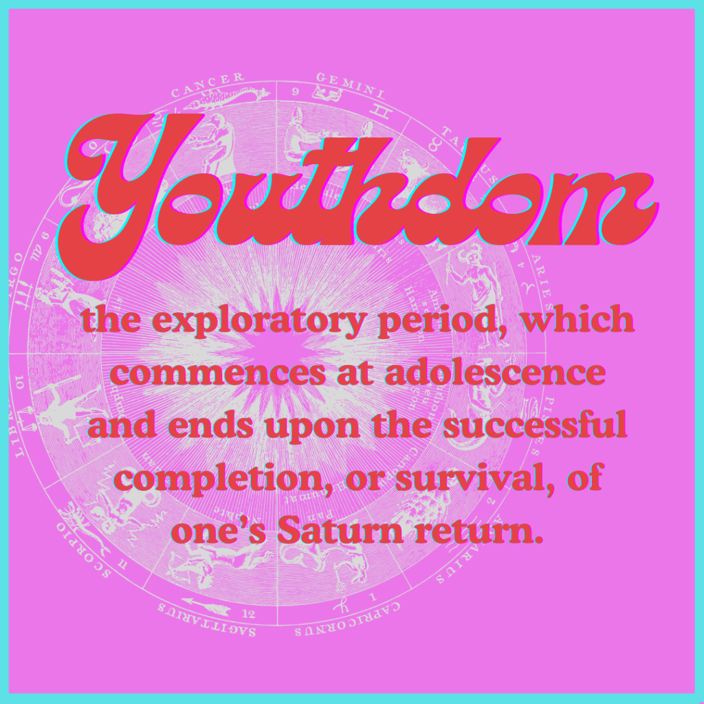 as i approach a new decade, i’ve been in meditation about where i am and where i once was, in the land of youthdom. i like to think of youthdom as that exploratory period which commences at adolescence and ends upon the successful completion, or survival, of one’s Saturn return.