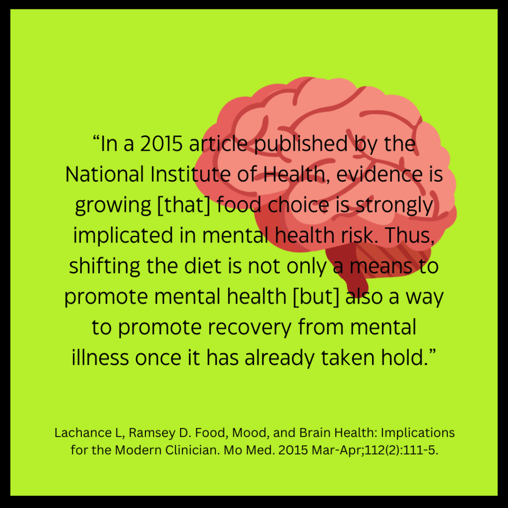 In a 2015 article published by the National Institute of Health, evidence is growing [that] food choice is strongly implicated in mental health risk. Thus, shifting the diet is not only a means to promote mental health [but] also a way to promote recovery from mental illness once it has already taken hold.[4][5]