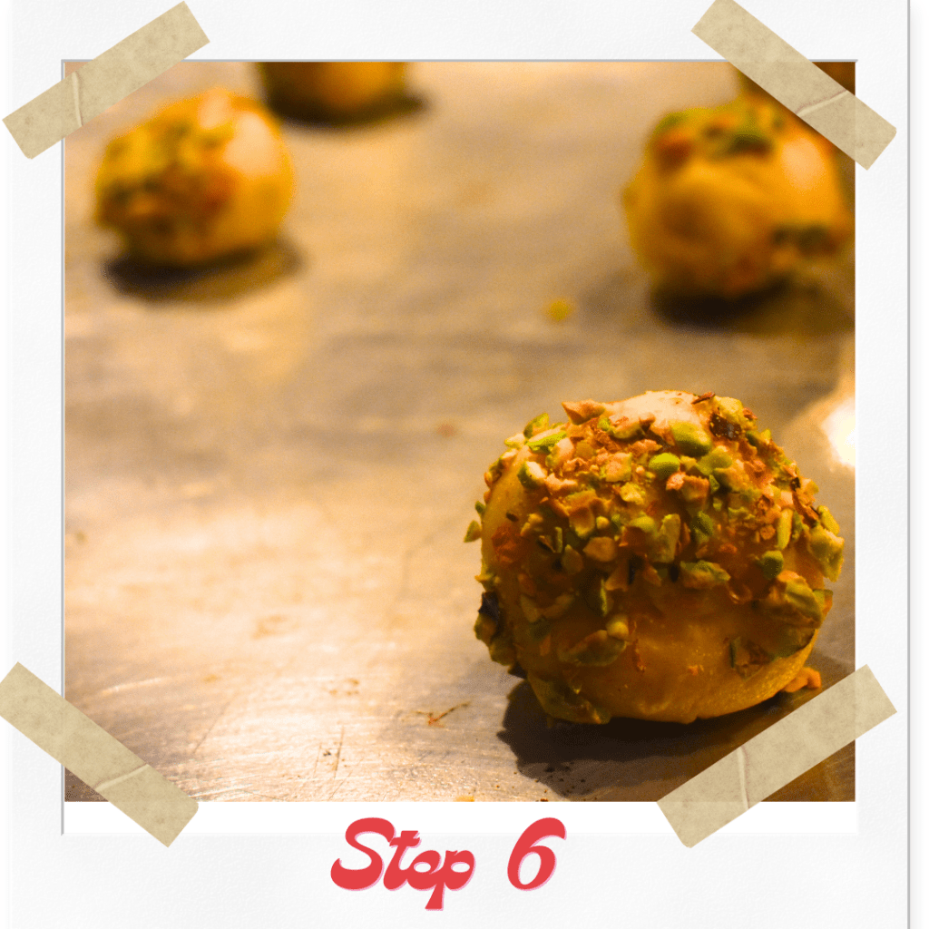 Roll chilled cookie dough balls into chopped pistachios so the entire area surface of the dough is covered and preheat your oven to 350°.