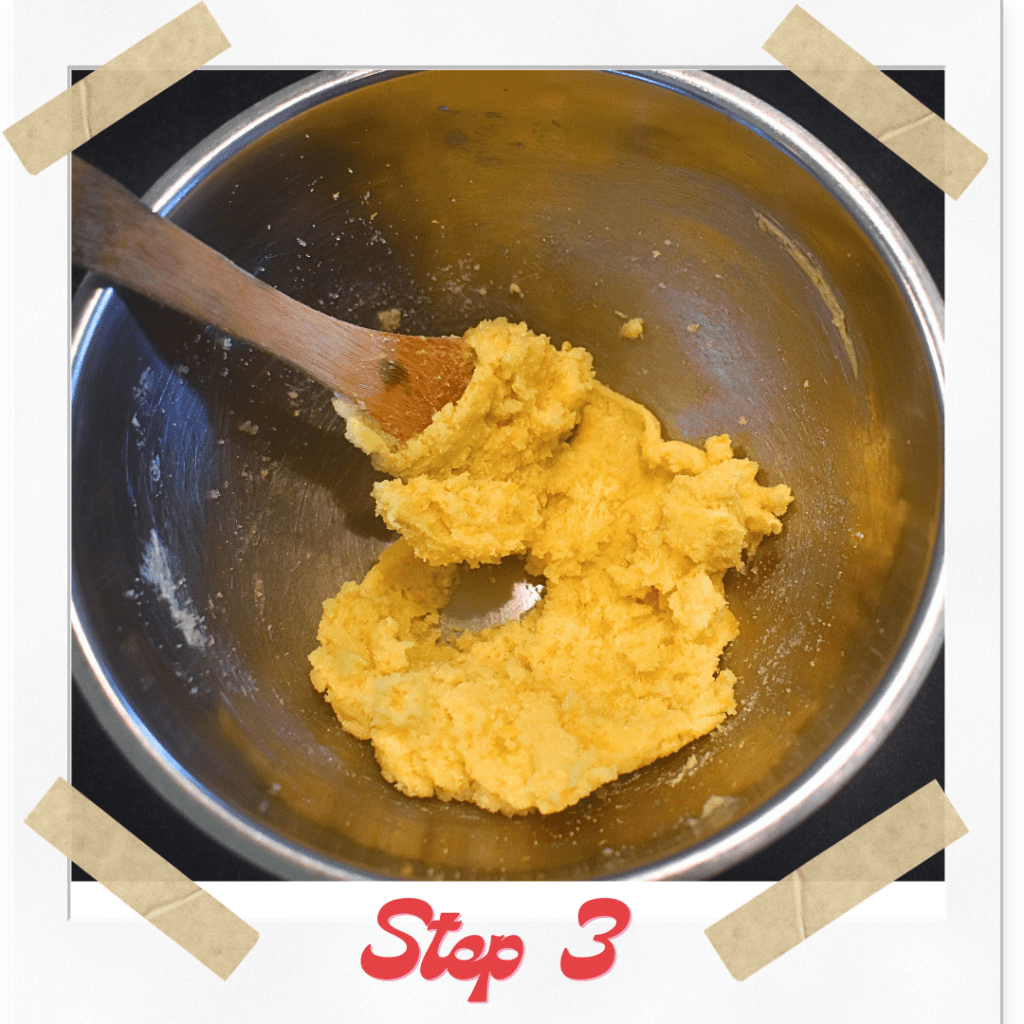 Cream 1 stick of room temperature butter into sugar mixture. Again, I like to do this by hand.