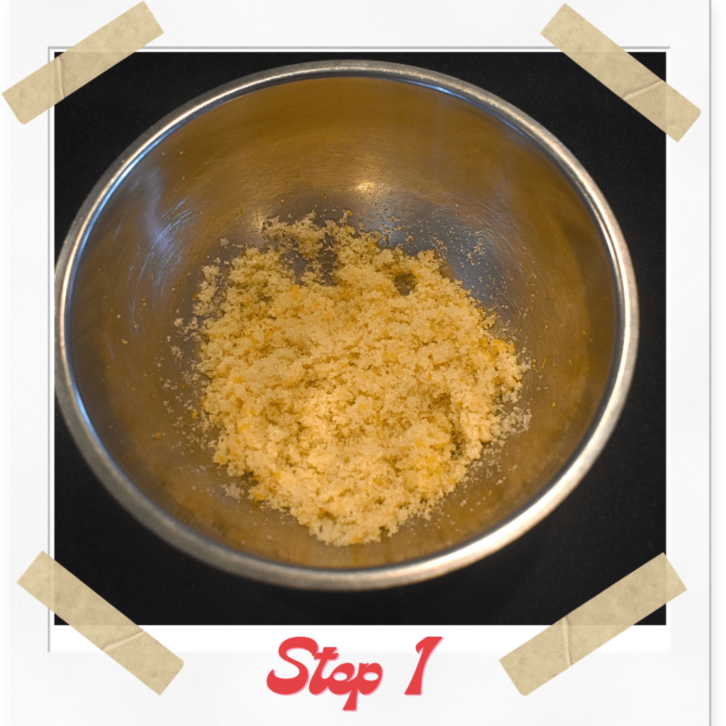 Using the zest from one whole lemon, combine with 1 cup caster sugar. I like to mix this by hand to ensure the oils from the lemon zest are released into the sugar; let this rest and marry for at least 45 minutes. In the interim, finely chop your pistachios.