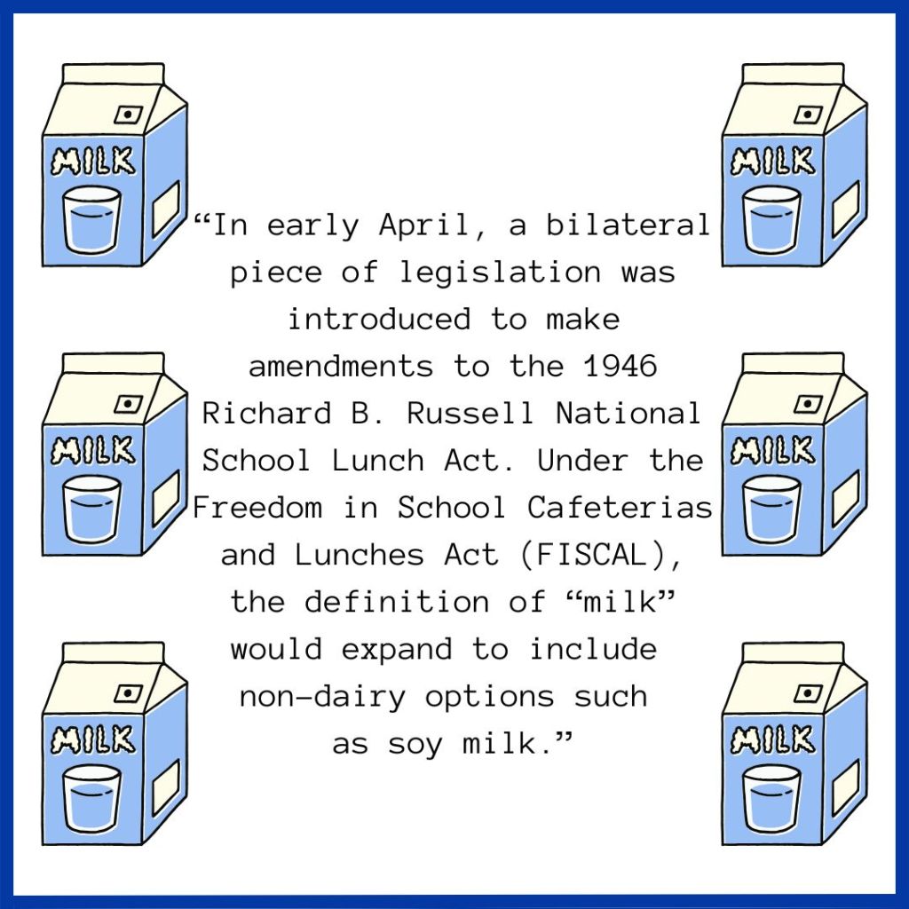 in early April, a bilateral piece of legislation was introduced to make amendments to the 1946 Richard B. Russell National School Lunch Act. under the Freedom in School Cafeterias and Lunches Act (FISCAL), the definition of “milk” would expand to include non-dairy options such as soy milk.[1]
